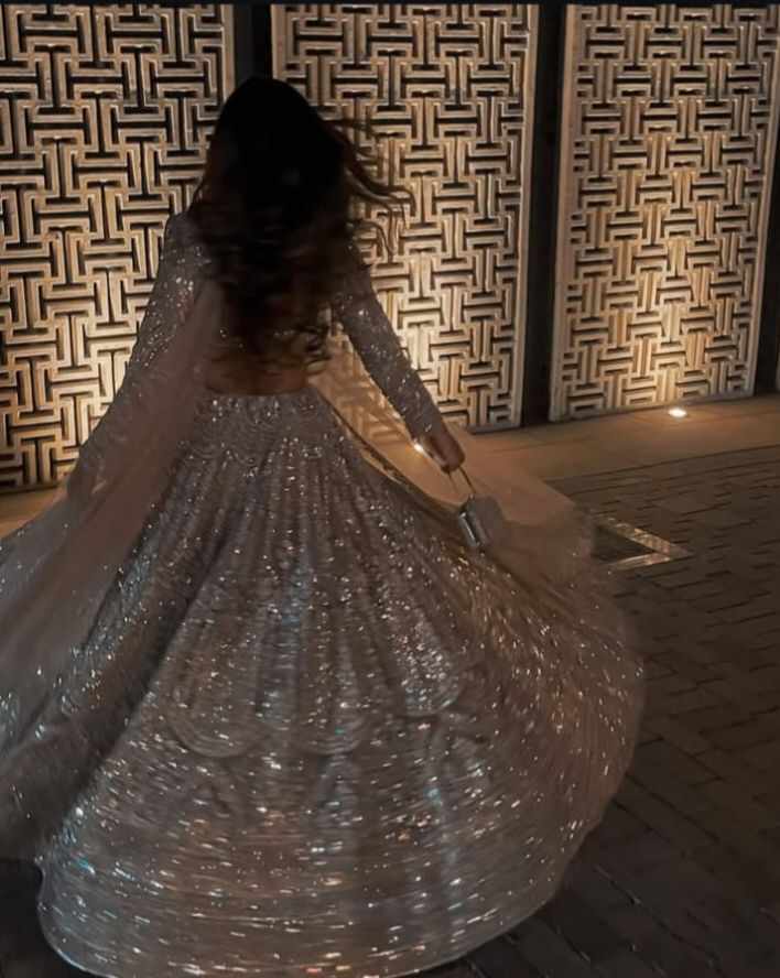 She was dressed in a beautiful green sharara with silver mirror work all over the borders. A netted dupatta rested over her shoulder.